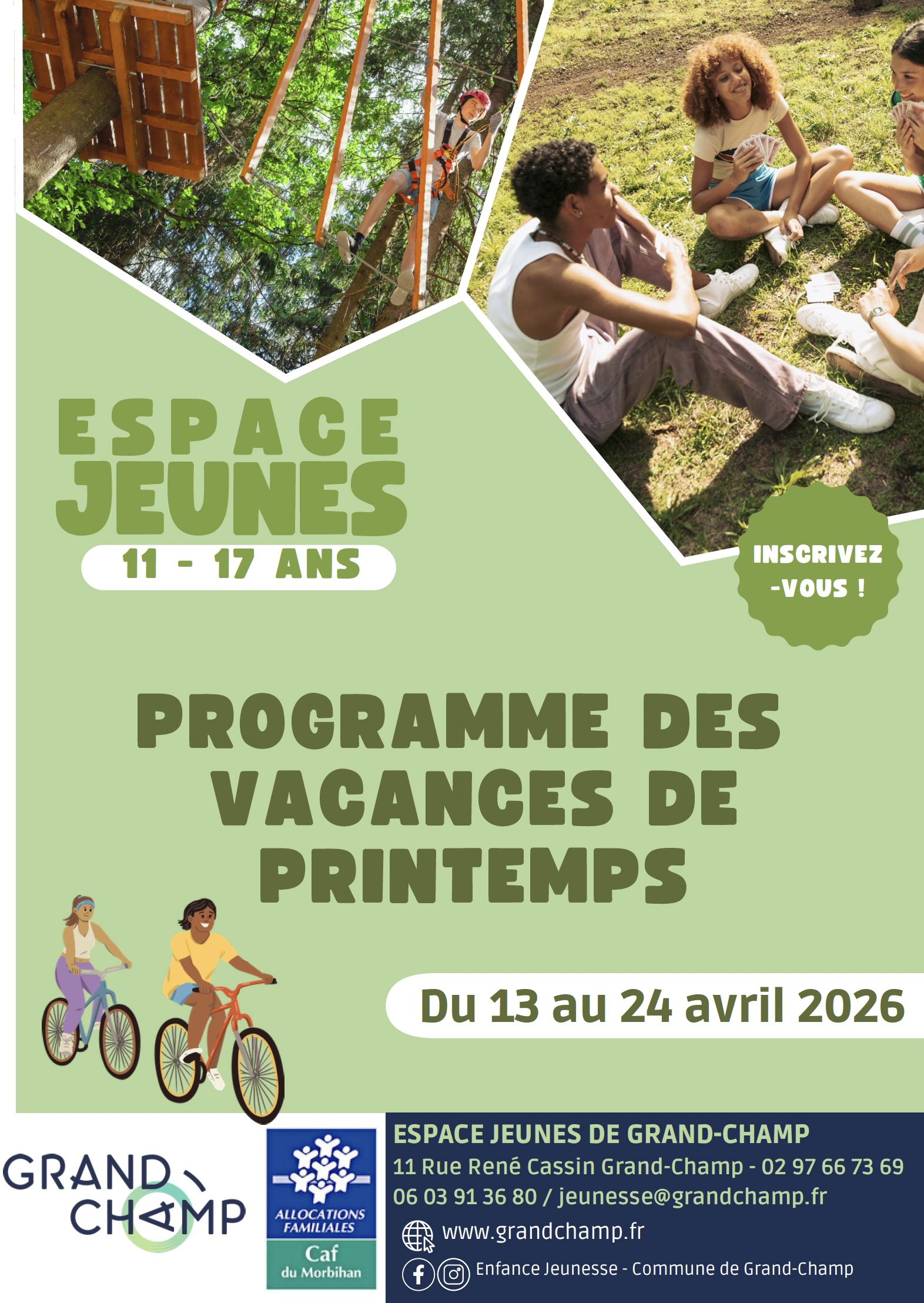 Durant toutes les vacances scolaires, la commune de Grand-Champ organise un accueil de loisirs ALSH (sans hébergement) destiné aux 11-17 ans.