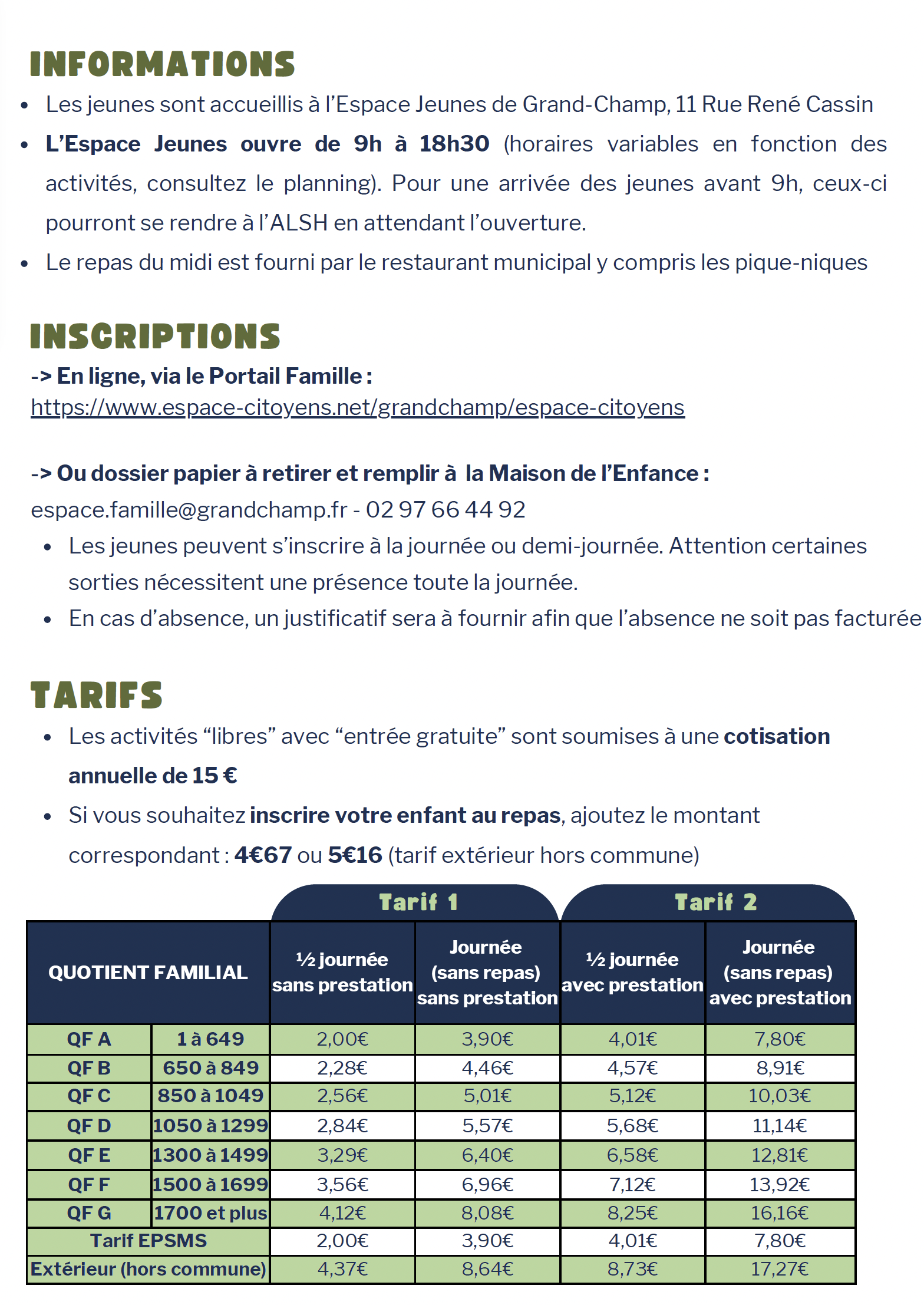 Ces activités sont destinées prioritairement aux enfants et aux jeunes issus de la commune de Grand-Champ. Elles se déroulent à l'Espace Jeunes - 11 Rue René Cassin, 56390 Grand-Champ.