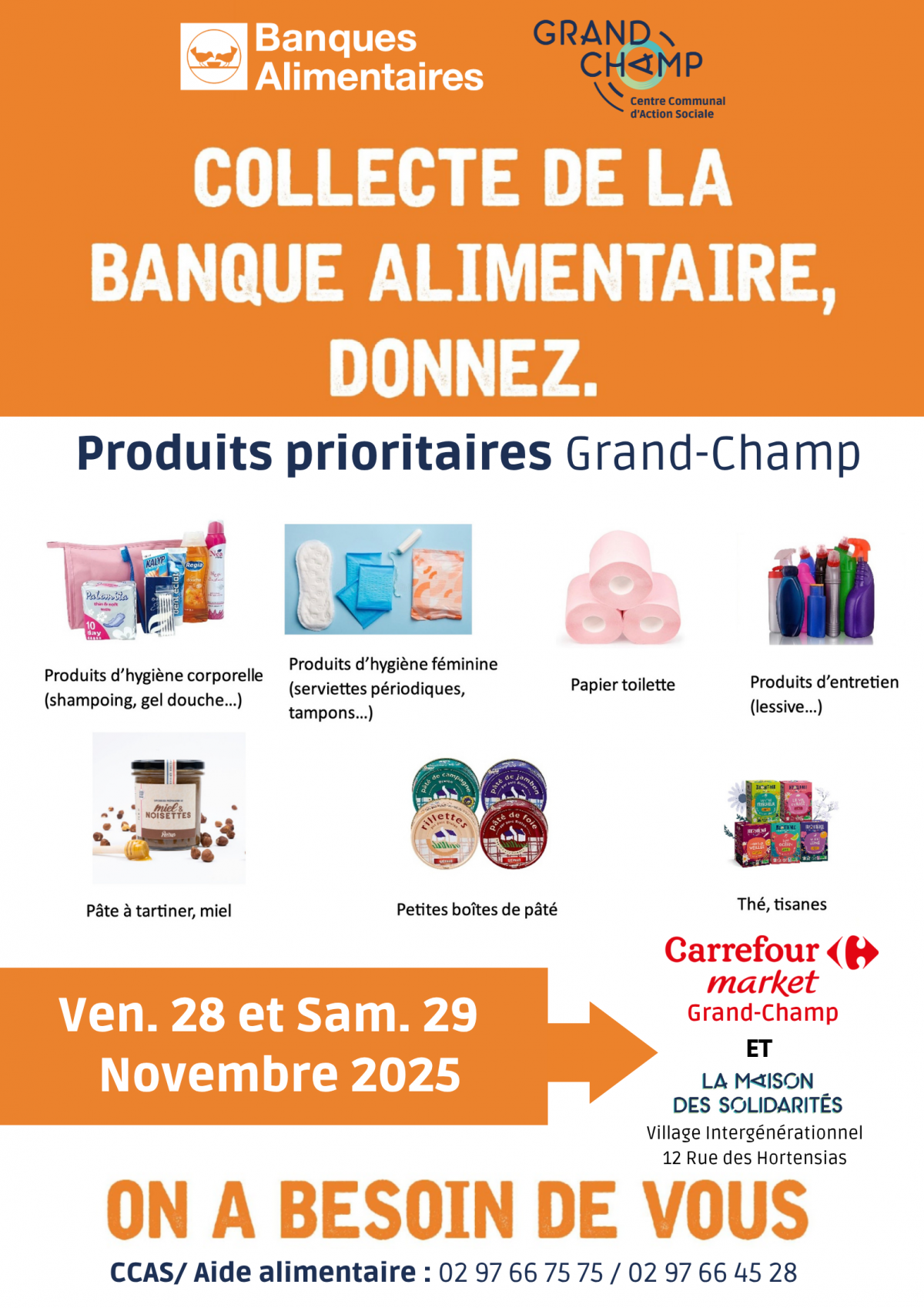 🦺 Les bénévoles du Relais Loch Solidaire (l'aide alimentaire du territoire de Grand-Champ) et leurs « Gilets orange » seront présents à deux endroits pour solliciter et recueillir vos dons :1️⃣ Magasin Carrefour Market Grand-Champ