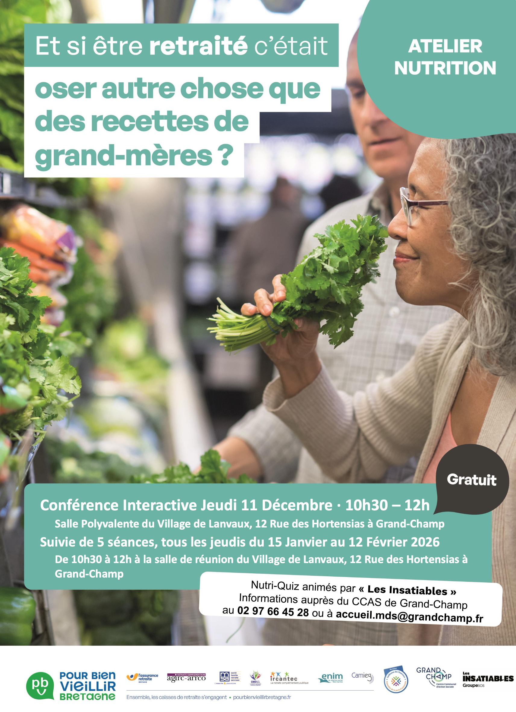 Le Jeudi 11 Décembre de 10h30 à 12h, l’association Les Insatiables s’invite à Grand-Champ et proposera aux habitants de plus de 60 ans une conférence interactive sur l’alimentation pour vieillir en bonne santé ! Cette conférence est publique et ouverte à toute personne retraitée.