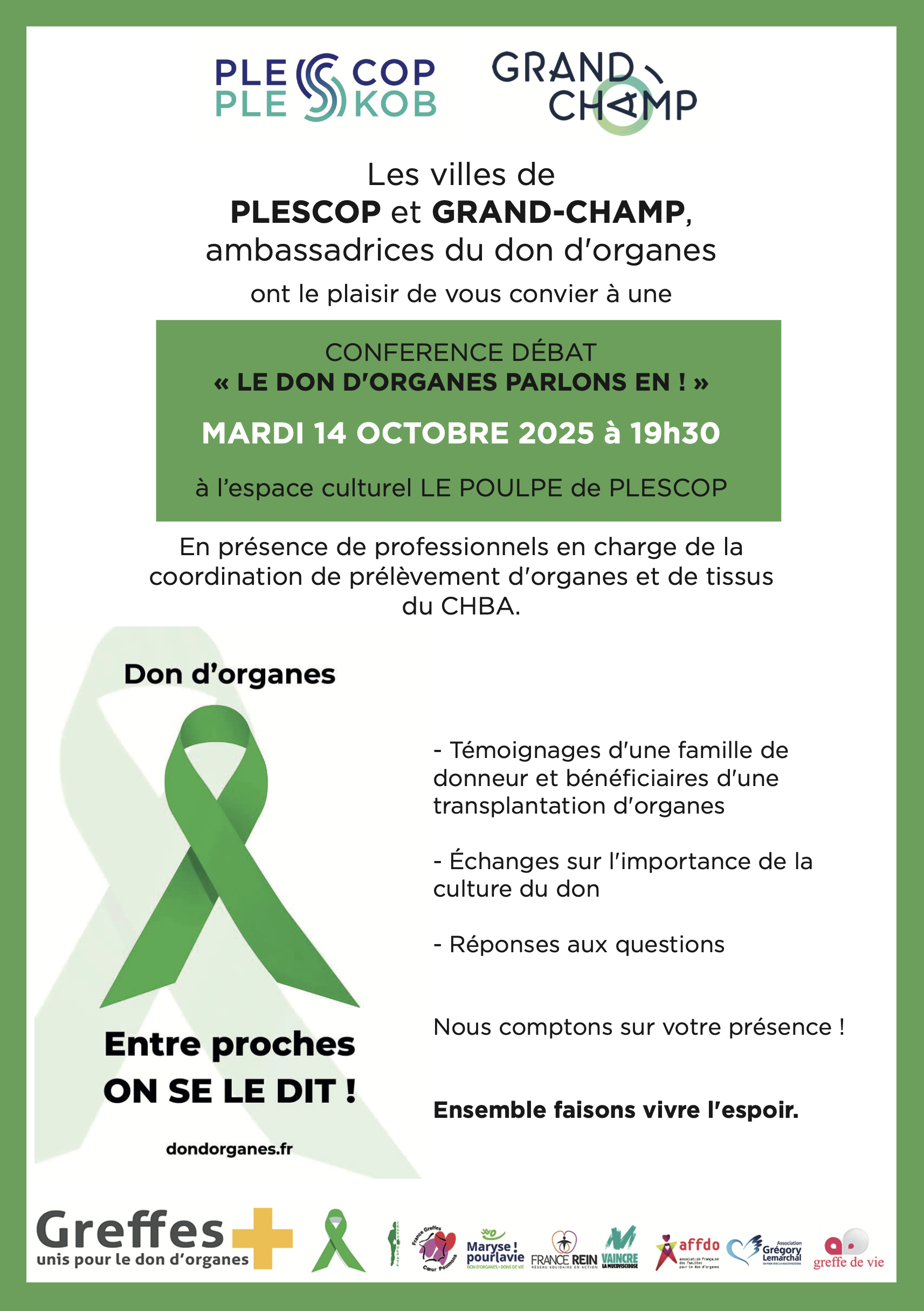 Plescop et Grand-Champ, villes ambassadrices du don d'organes, organisent une conférence - débat sur le thème :