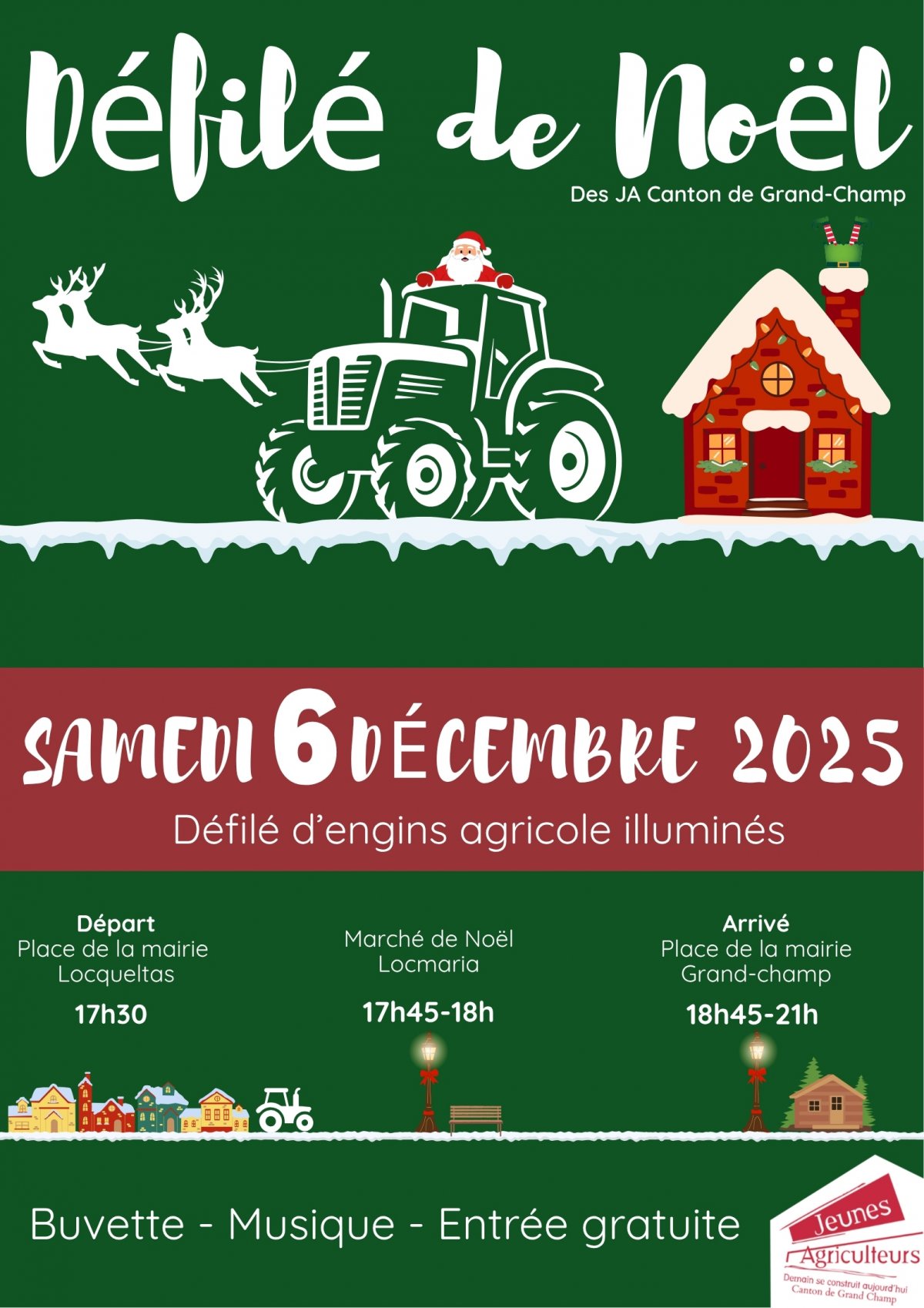 🚜 Et oui, c'est une nouveauté 2025... Les Jeunes Agriculteurs du canton de Grand-Champ organisent un défilé d'engins agricoles illuminés le samedi 6 décembre 2025, dont l'arrivée se fera au marché de Noel de Grand-Champ !🎅 Vous pourrez les retrouver sur leur parcours enchanté :