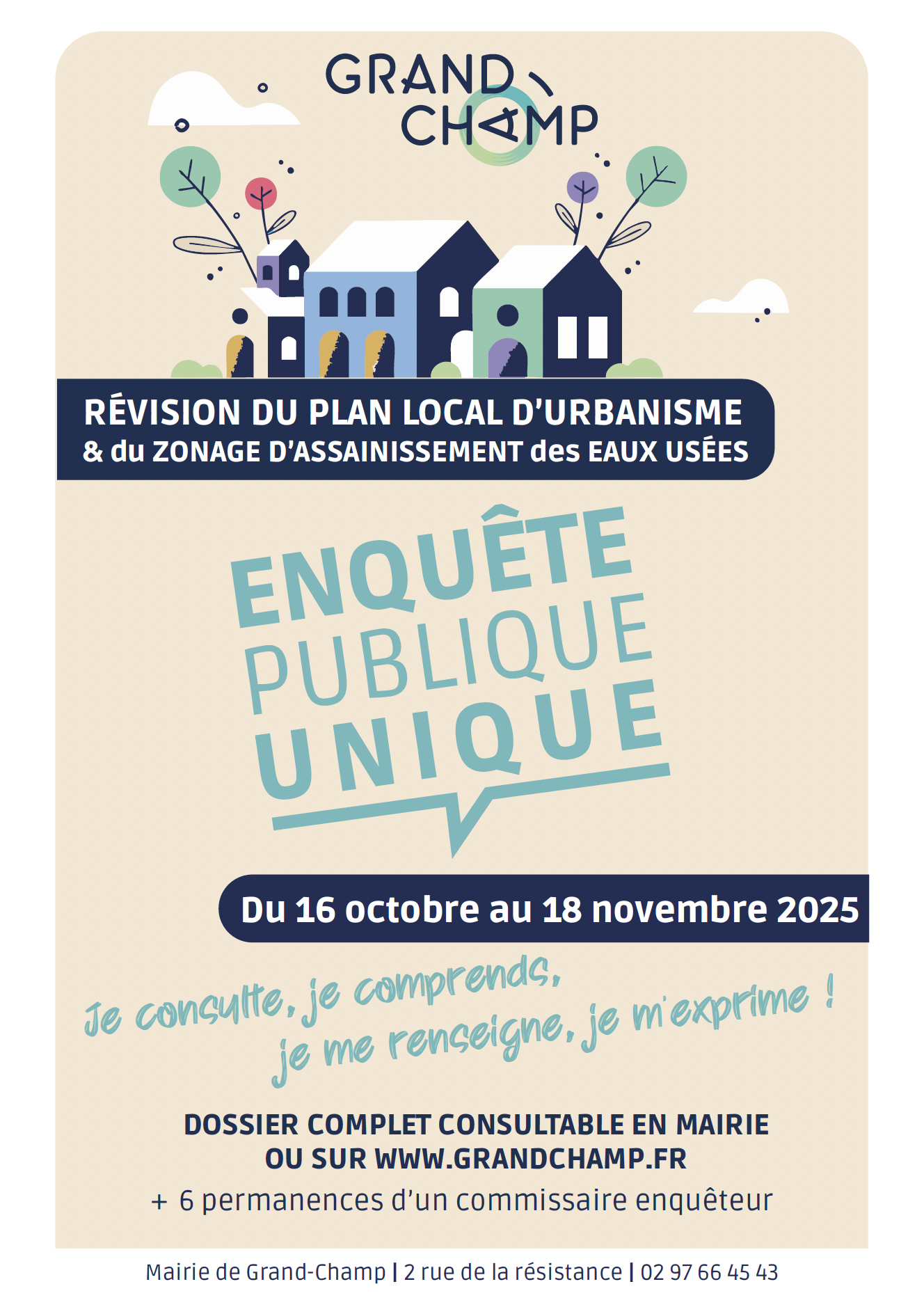 Par arrêté n°170/2025 en date du 24 septembre 2025, Madame le Maire de Grand-Champ a ouvert une enquête publique unique portant sur la révision du plan local d’urbanisme et du zonage d'assainissement des eaux usées de la commune de Grand-Champ pour une durée de trente-quatre (34) jours du jeudi 16 octobre 2025 à 9h00 au mardi 18 novembre 2025 à 17h30 en mairie de Grand-Champ.