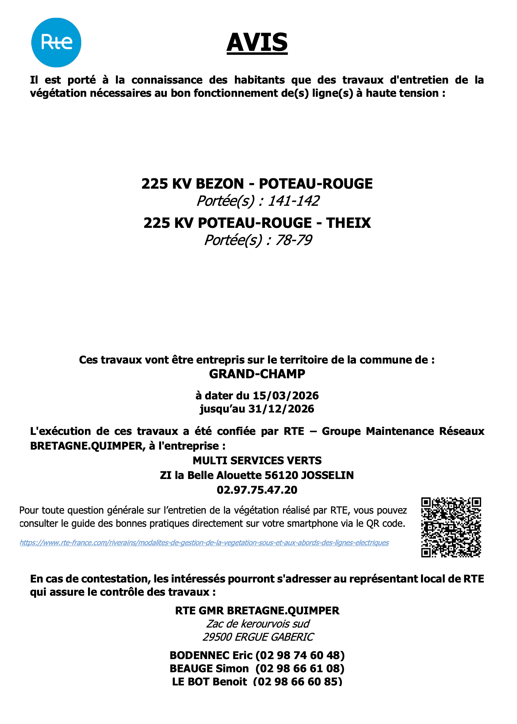 La société RTE nous informe que des travaux d'entretien de la végétation vont être entrepris à compter du lundi 16 mars jusqu’à la fin de l’année 2026 sur le territoire de Grand-Champ, afin d'assurer le bon fonctionnement des lignes haute tension, mais également la sécurité des personnes aux abords de ces ouvrages.