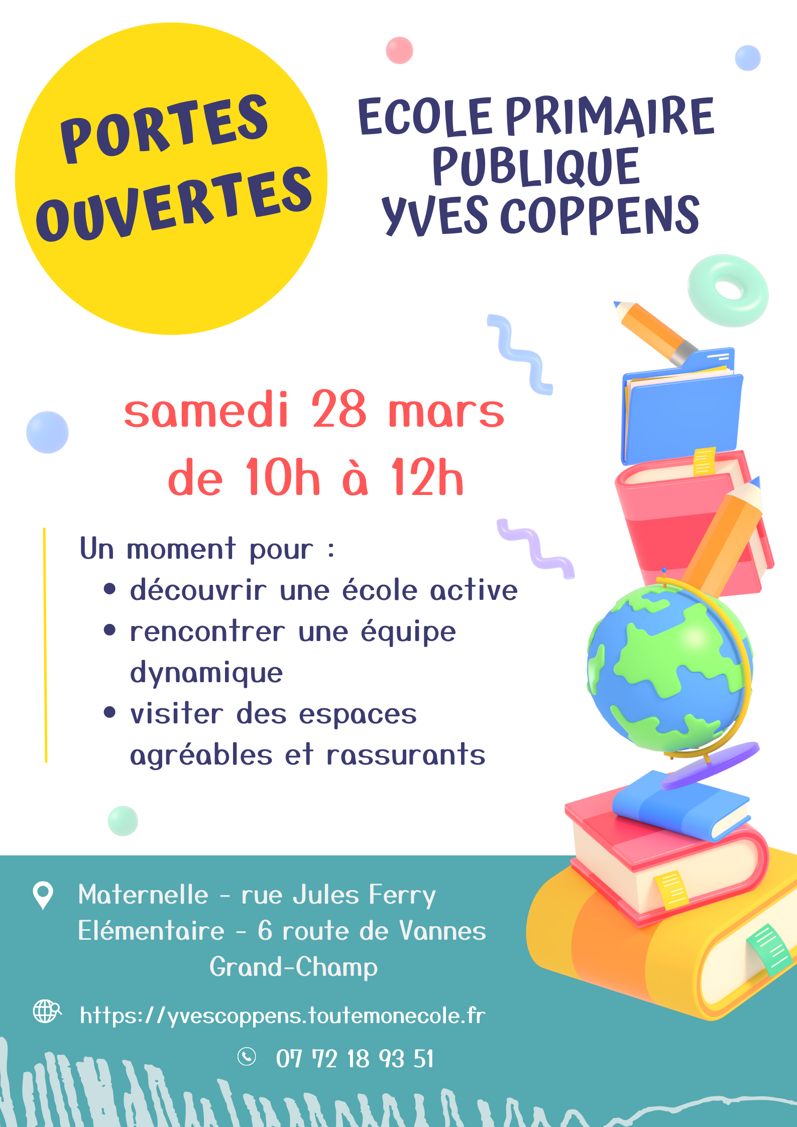 28 Mar. Éducation / Jeunesse Portes ouvertes école Yves Coppens L'école primaire publique Yves Coppens ouvre ses portes le samedi 28 mars 2026 de 10h à 12h.Un moment pour : découvrir une école activerencontrer une équipe dynamiquevisiter des espaces agréables et rassurants