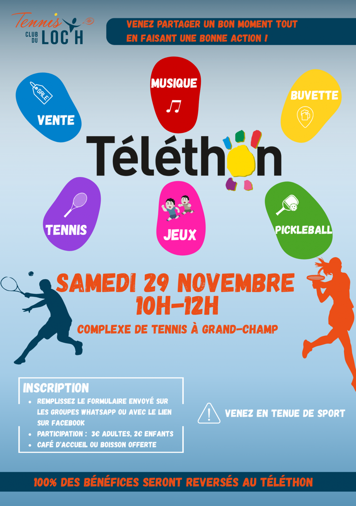 Le Tennis Club du Loch invite toute la population, petits et grands, enfants et adultes à participer à notre matinée d'animation au profit du Téléthon le samedi 29 novembre à 10h00