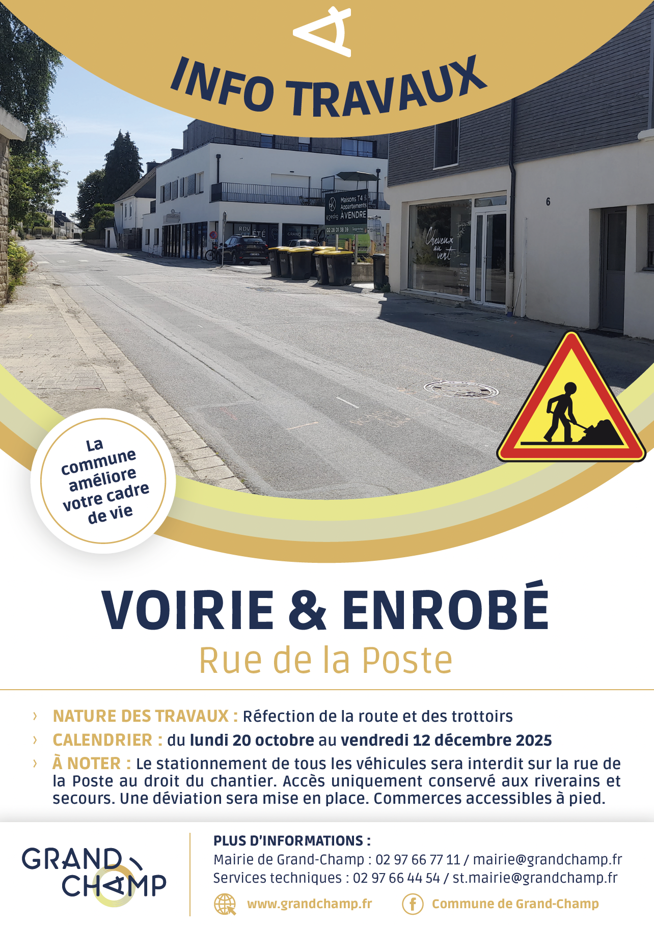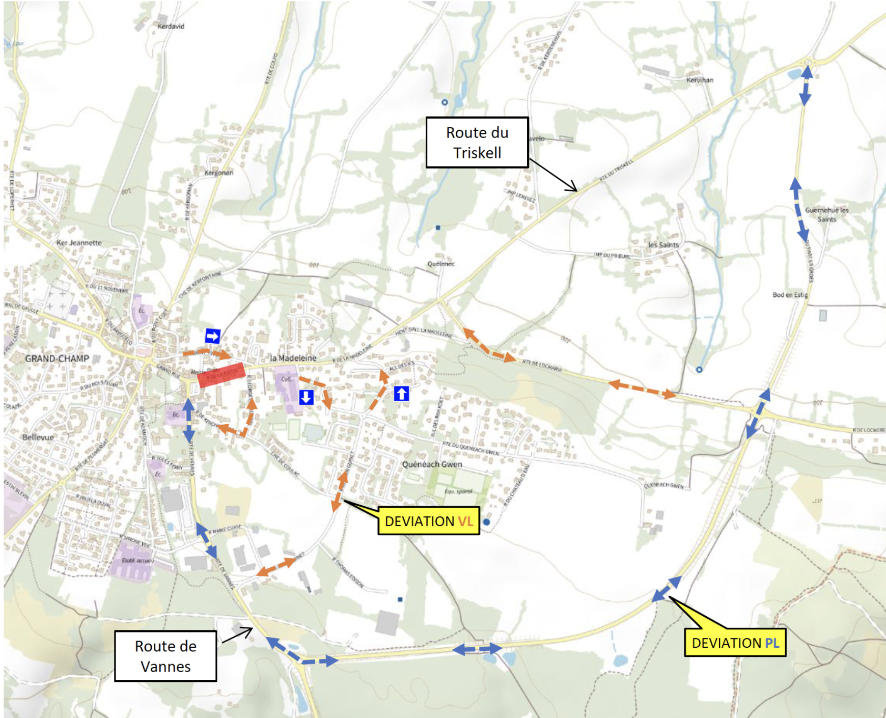 La rue de la Poste sera barrée de la mairie jusqu'à l'intersection de la rue Saint-Yves à tous les véhicules, sauf ceux liés aux travaux susmentionnés. Les véhicules légers venant du bourg et souhaitant prendre la direction de Locmaria-Grand-Champ seront déviés par la Grand rue, la route de Vannes puis la rue de Kercharette. La rue Georges Cadoudal sera barrée à la circulation. La rue Saint-Yves sera barrée à hauteur de l'intersection avec la rue de la Poste.