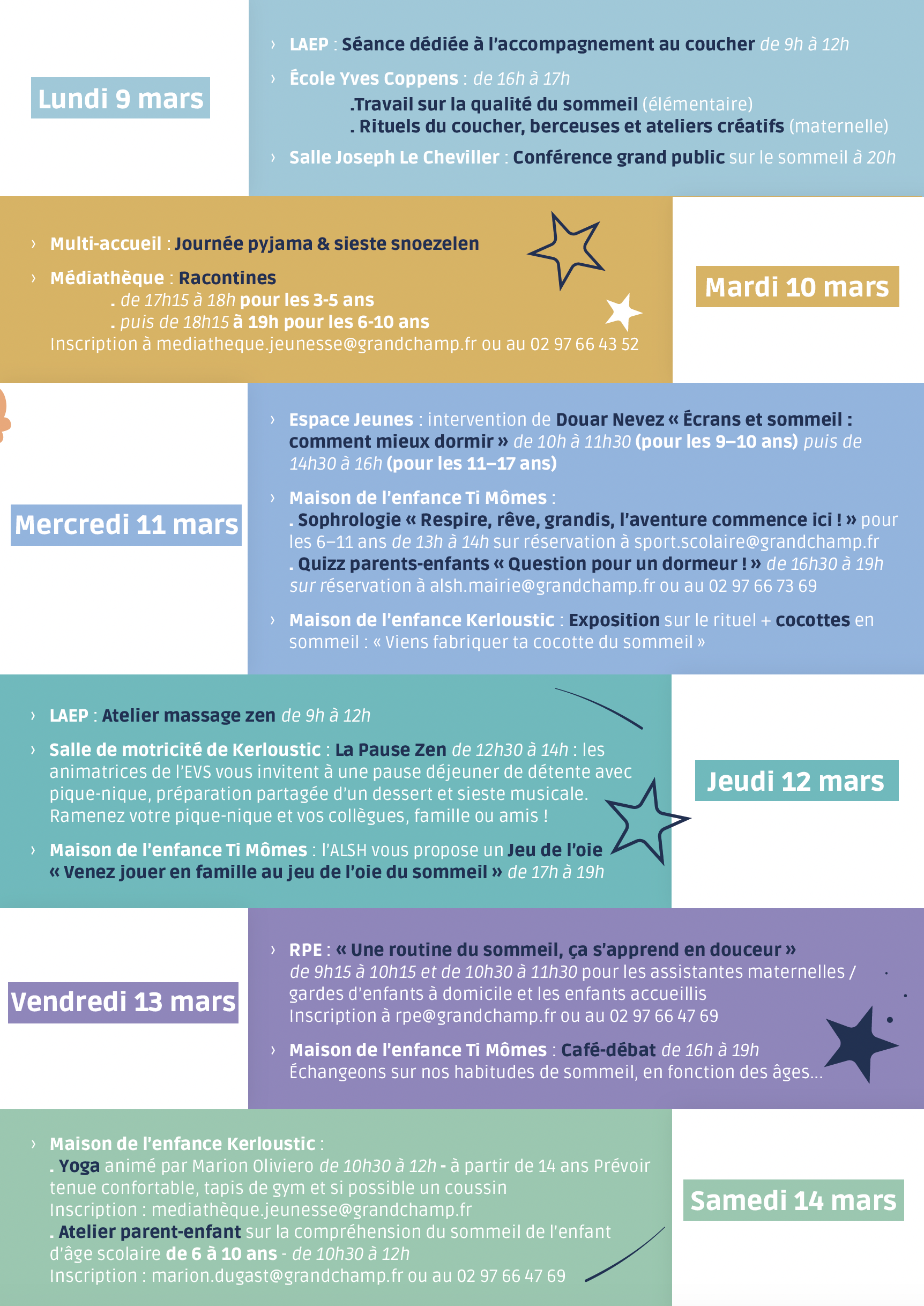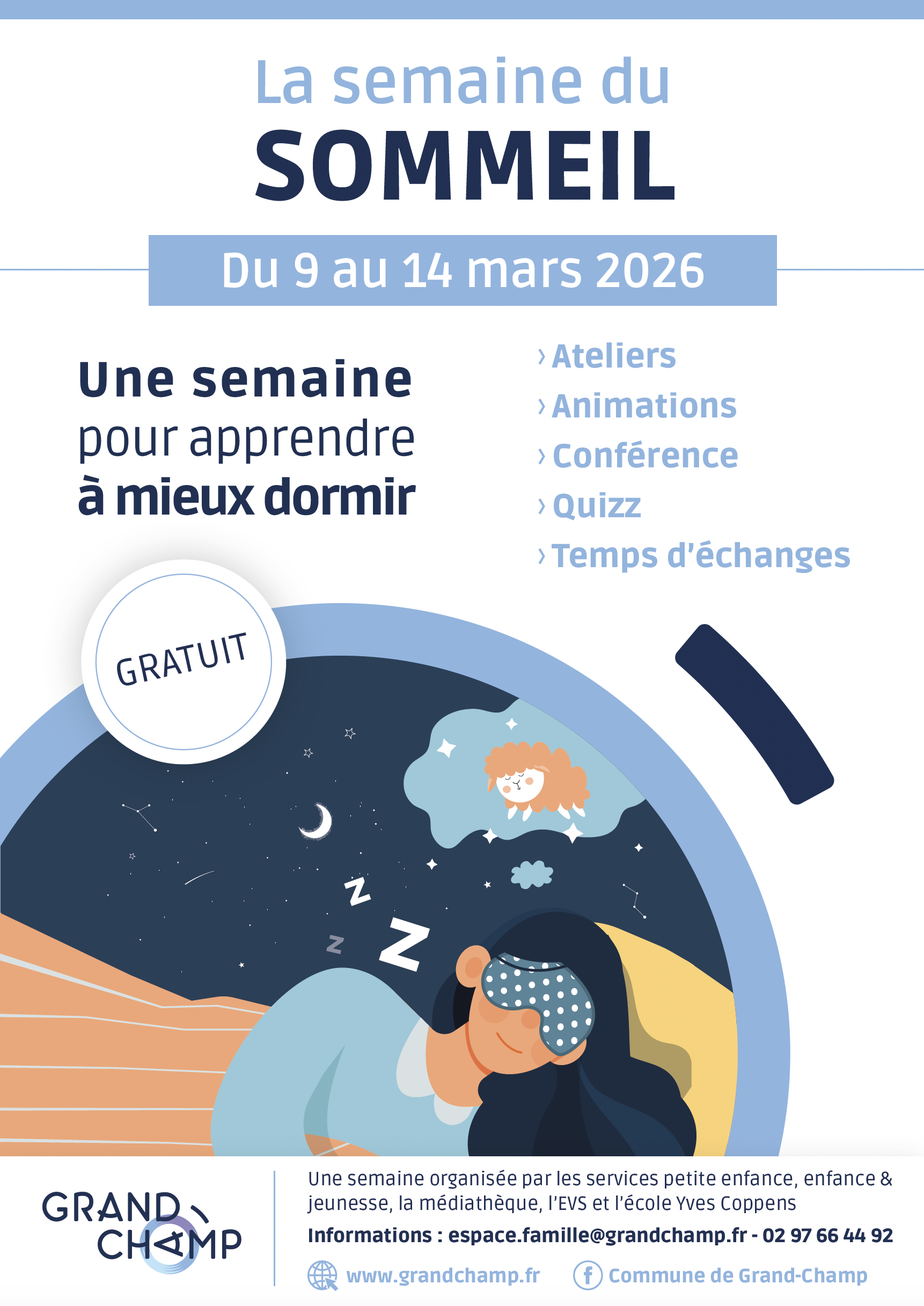 Pendant une semaine, la commune de Grand-Champ vous propose des animations, ateliers et temps d’échange gratuits, pour mieux comprendre le sommeil, améliorer ses nuits et prendre soin de soi… à tout âge.