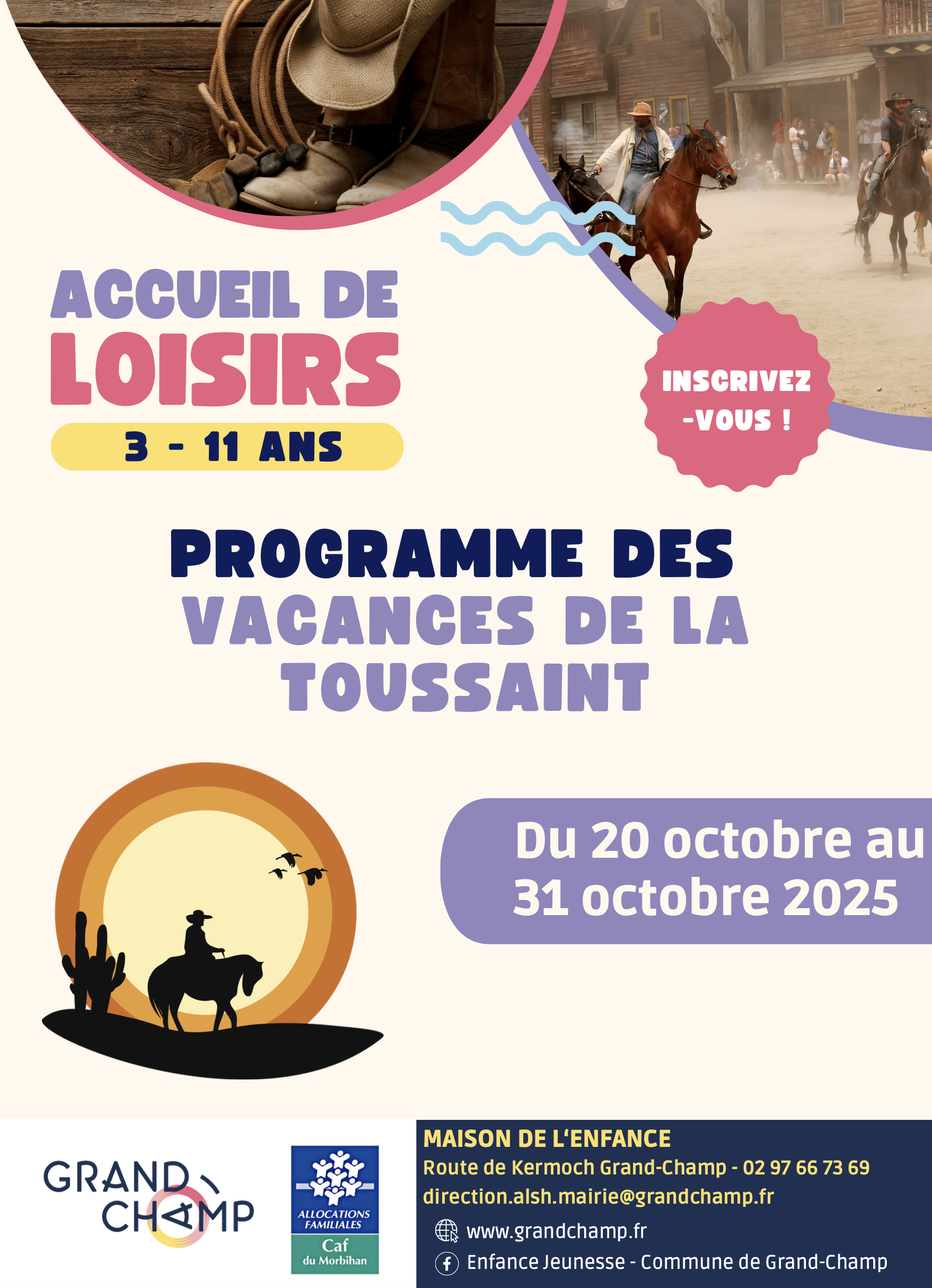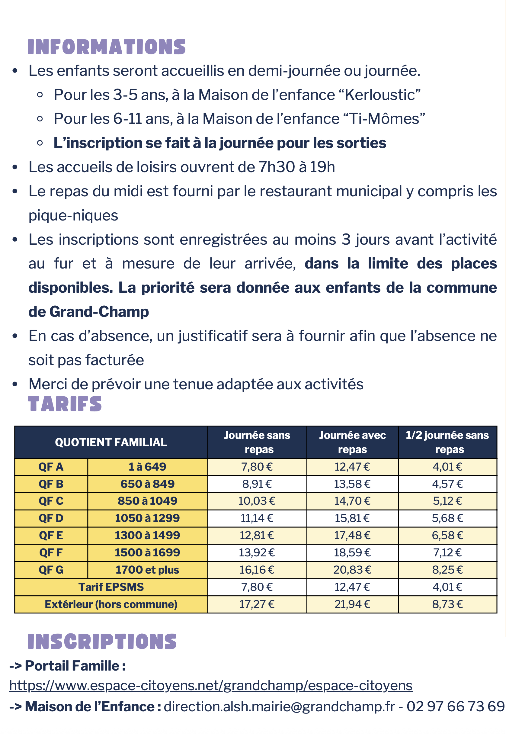 Contact : Maison de l'Enfance / 02 97 66 73 69 / alsh.mairie@grandchamp.fr