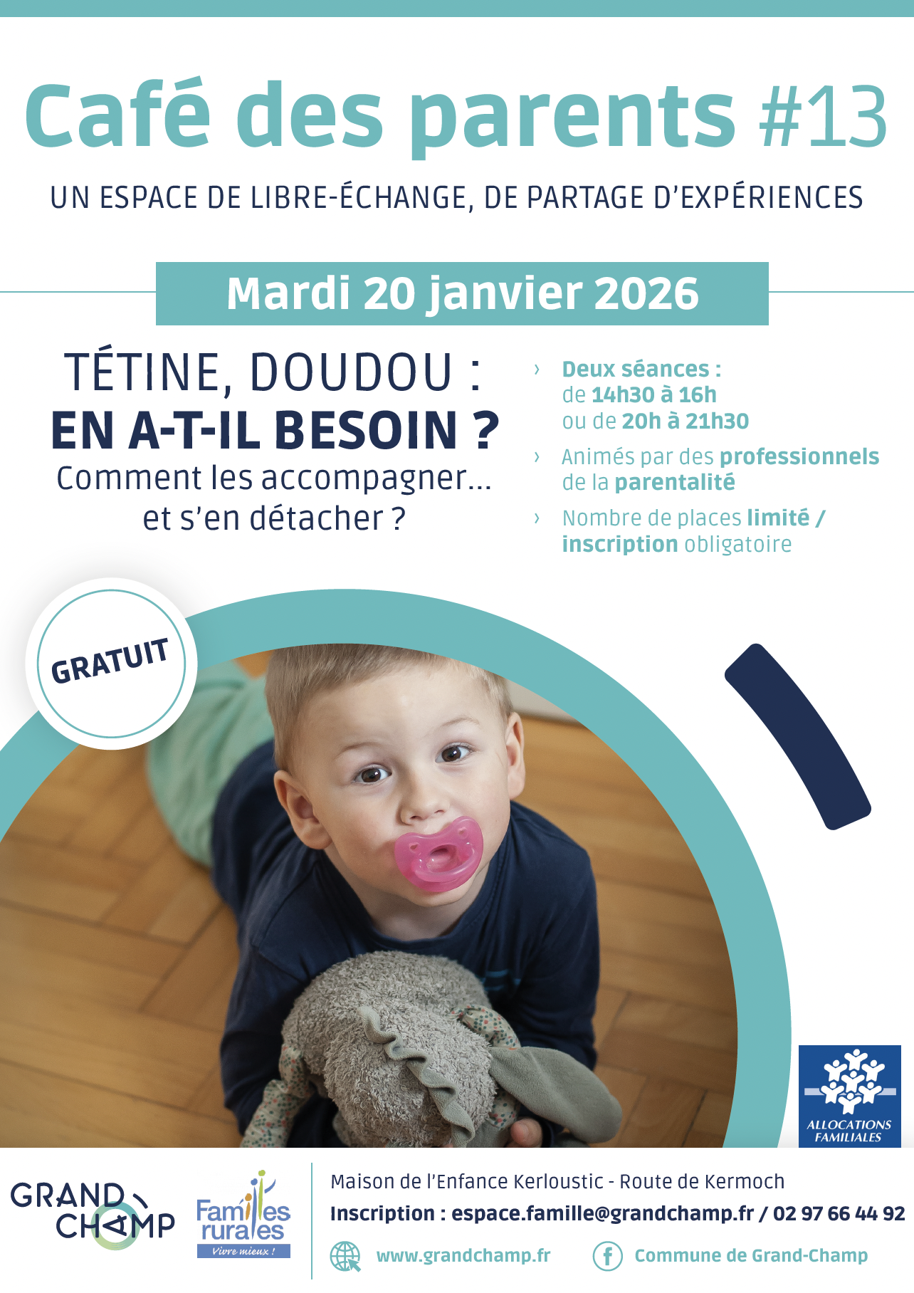 Inscription obligatoire soit par mail à l’adresse suivante : espace.famille@grandchamp.fr soit par téléphone au 02 97 66 44 92