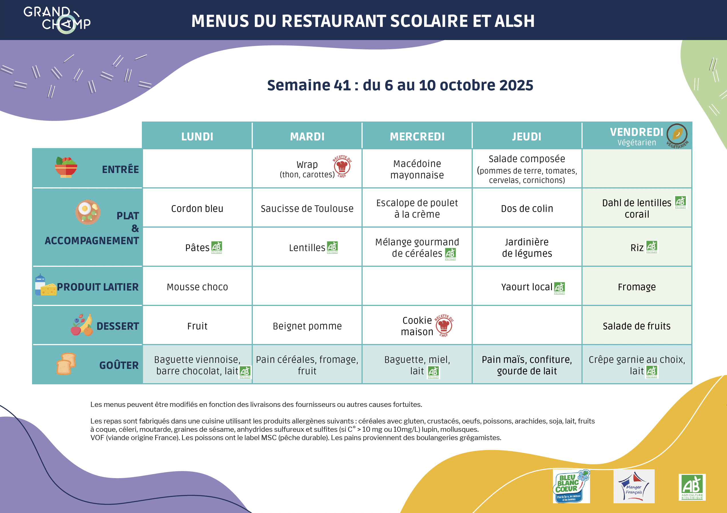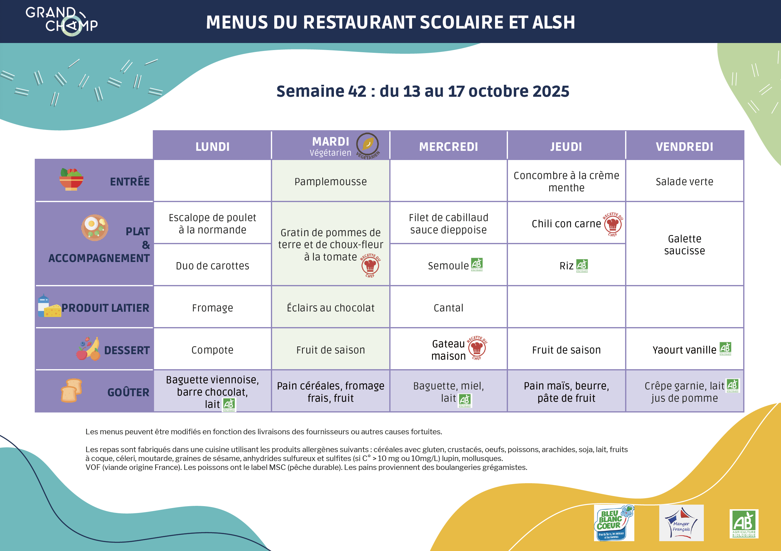Retrouvez ci-dessous les menus annoncés en aperçu pour les prochaines semaines.