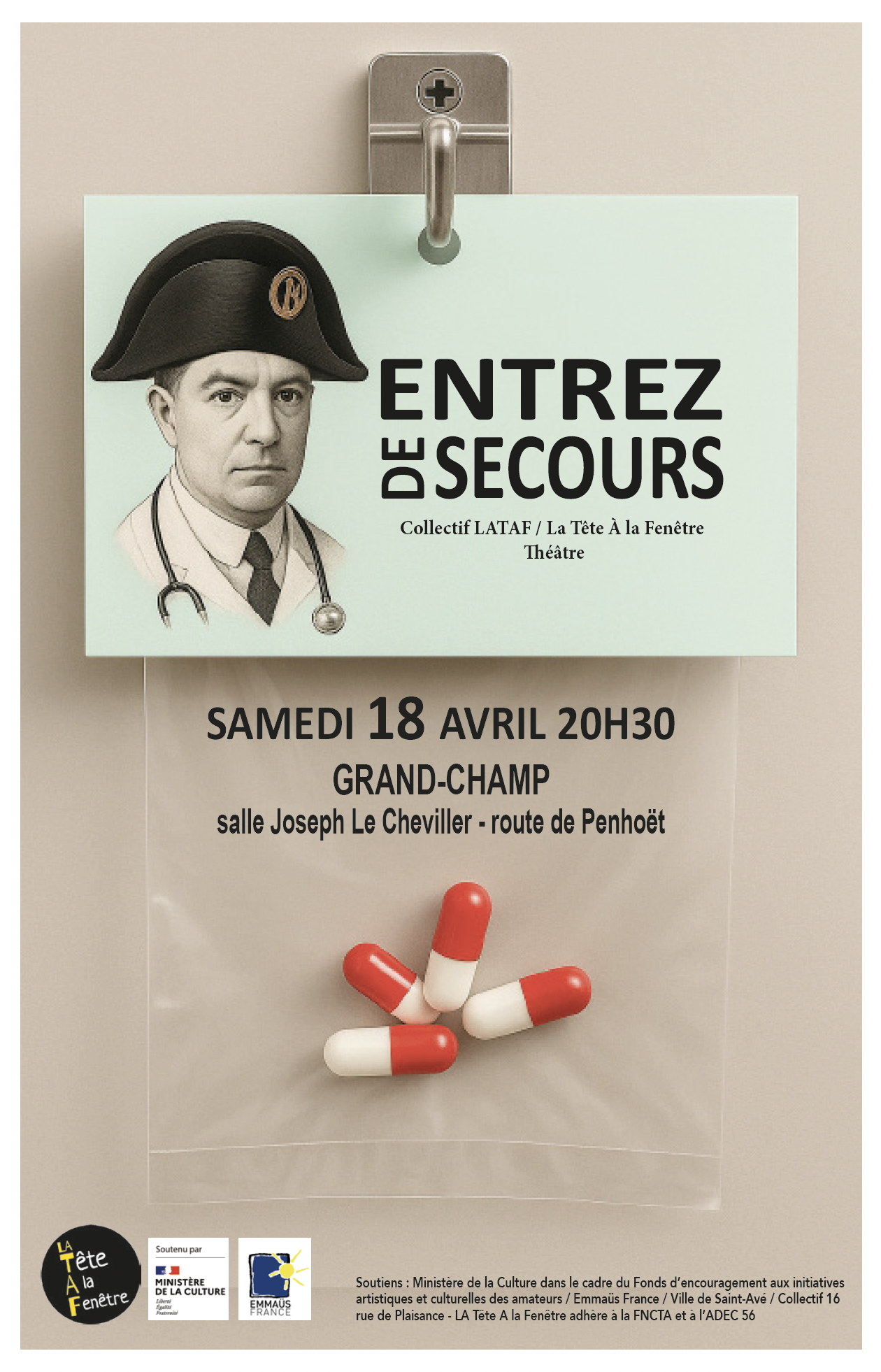 Entrez de Secours est une invitation paradoxale faite au spectateur d’entrer par une issue de secours en acceptetant de franchir une limite, d’aller dans un espace marginal où se trouvent les exclus, les fous, ceux dont on a peur et qu’on isole."