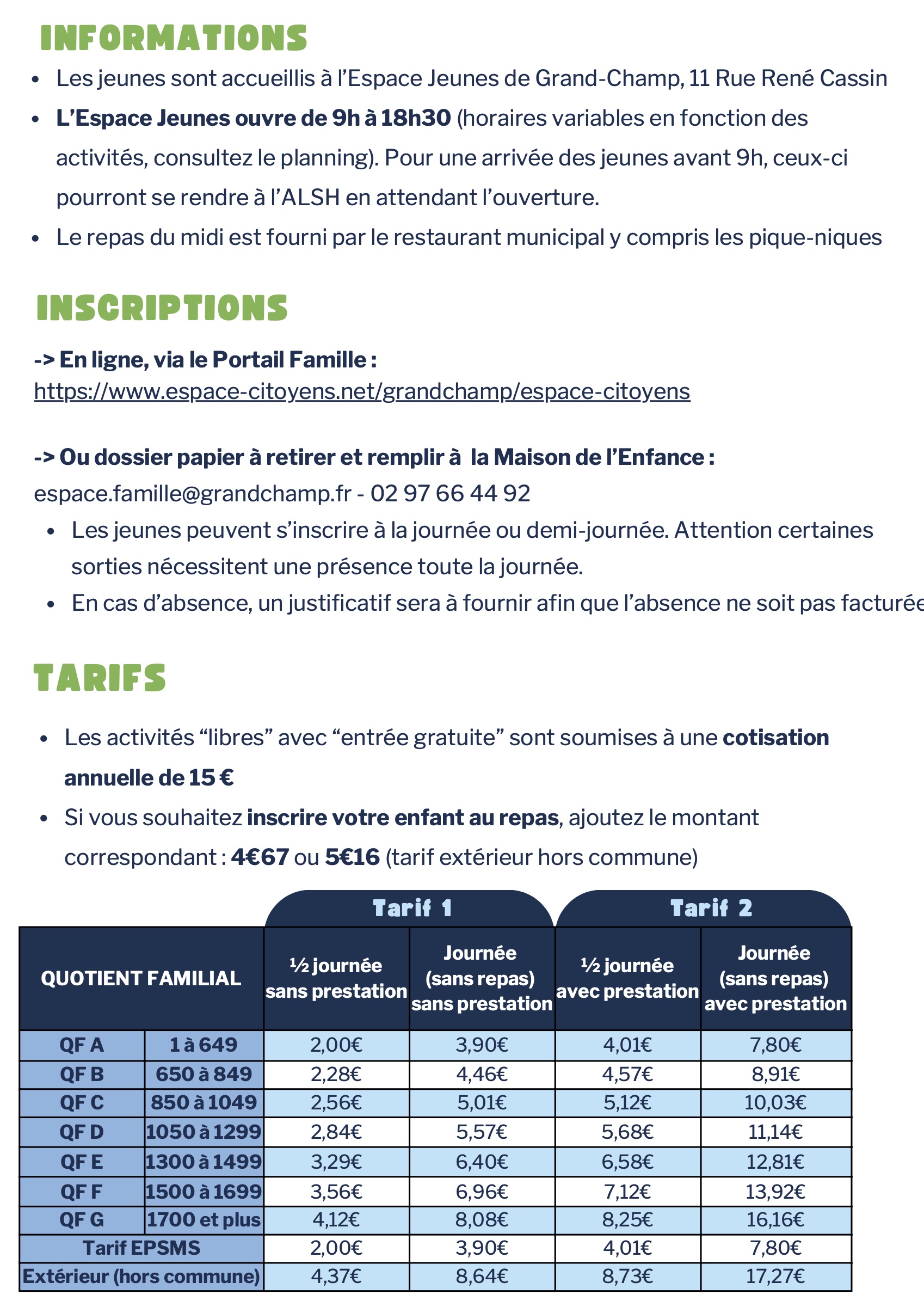 Ces activités sont destinées prioritairement aux enfants et aux jeunes issus de la commune de Grand-Champ. Elles se déroulent à l'Espace Jeunes - 11 Rue René Cassin, 56390 Grand-Champ.