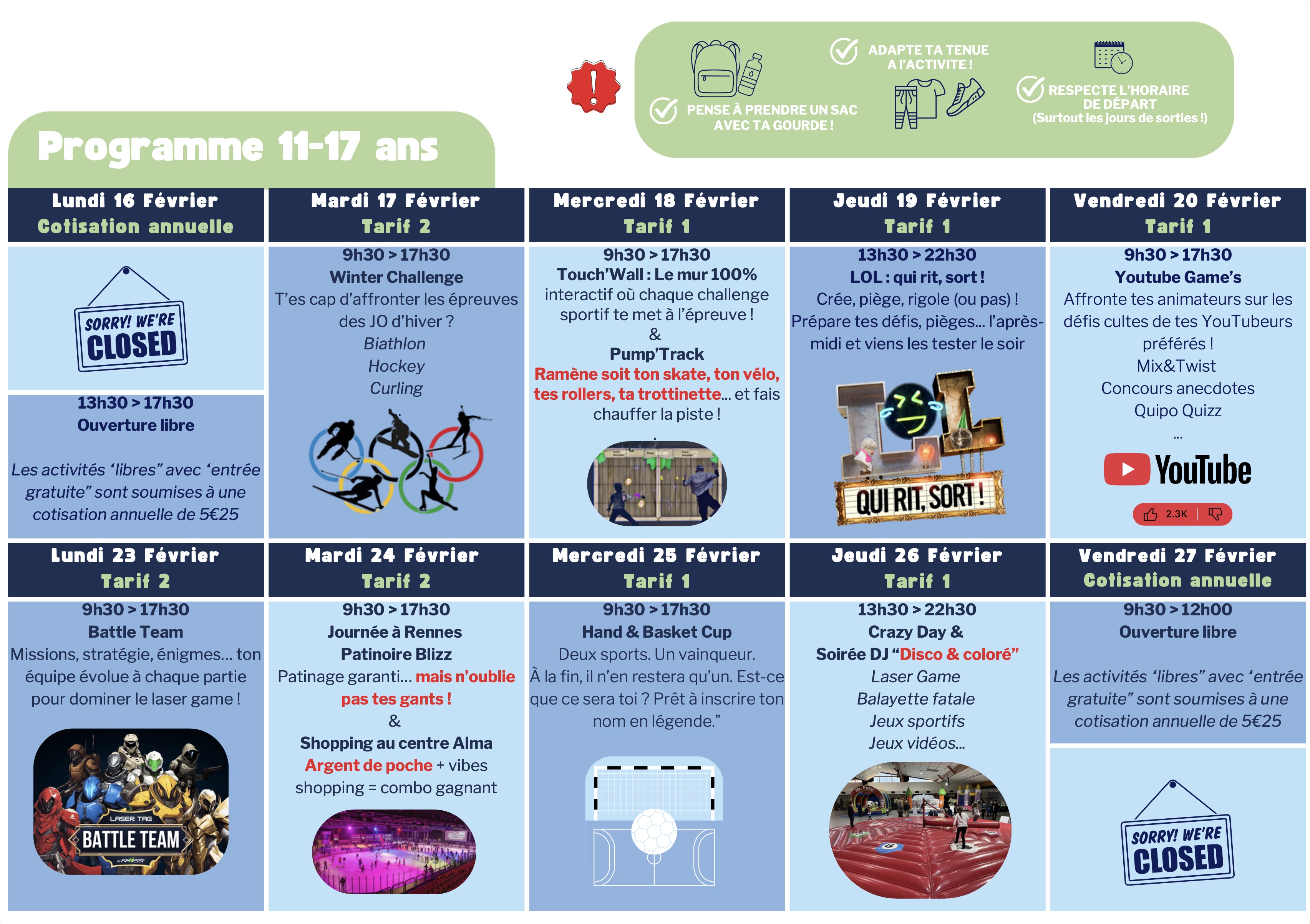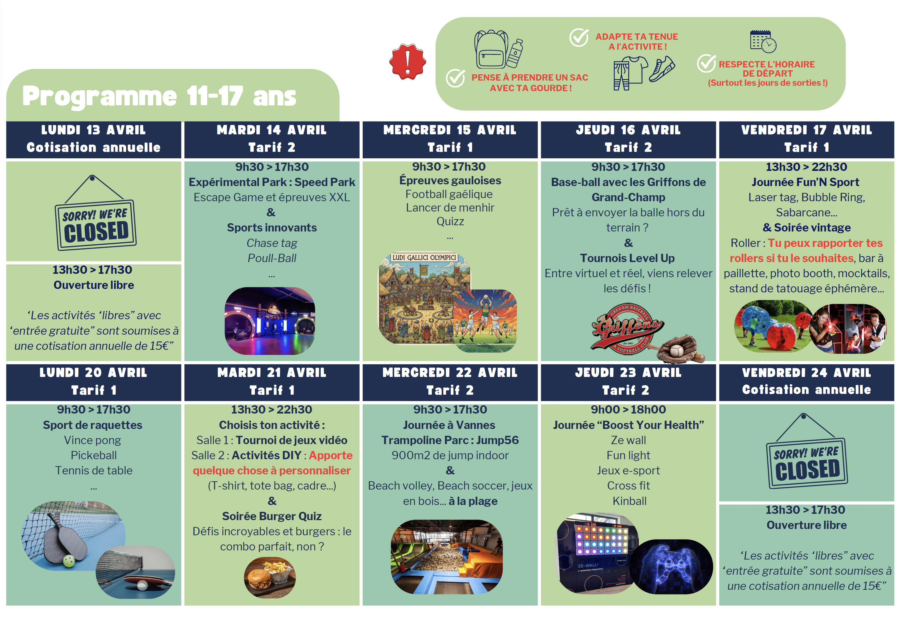 Merci de veiller à mettre des tenues adaptées aux activités proposées.