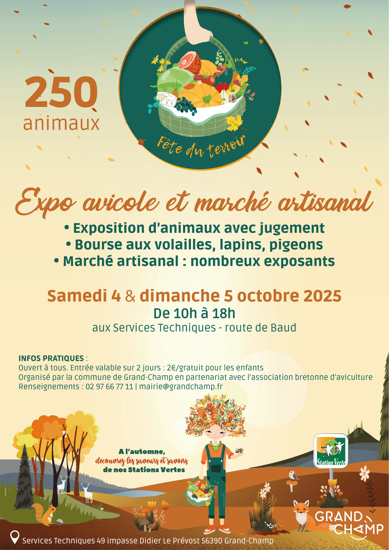 À Grand-Champ, commune labellisée Station Verte, la "Fête du Terroir" aura lieu les samedi 4 et 𝗱𝗶𝗺𝗮𝗻𝗰𝗵𝗲 5 𝗼𝗰𝘁𝗼𝗯𝗿𝗲, 𝗱𝗲 𝟭𝟬𝗵 𝗮̀ 𝟭𝟴𝗵, aux Services Techniques, route de Baud.