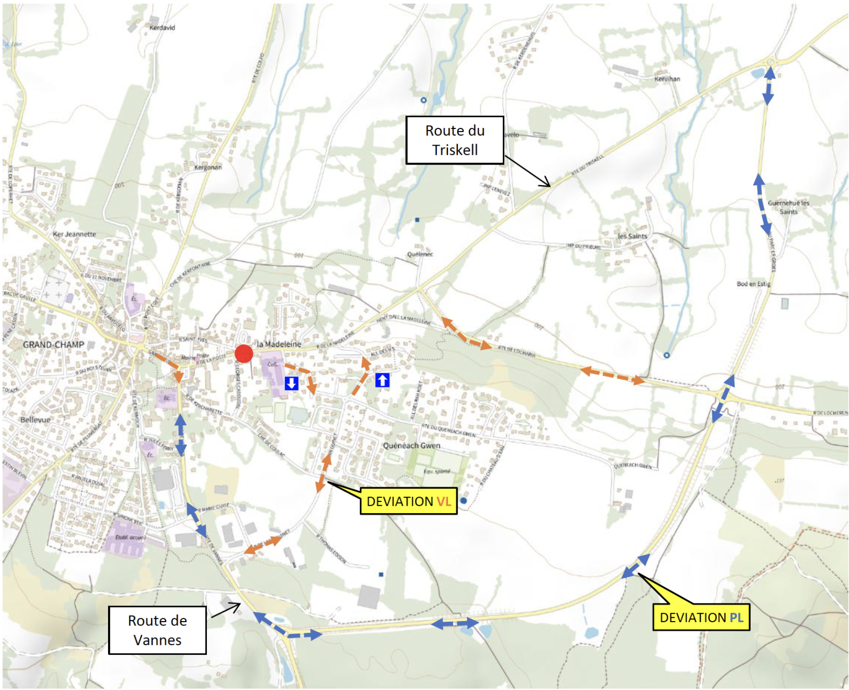 La rue de la Poste sera barrée de la mairie jusqu'à l'intersection de la rue Saint-Yves à tous les véhicules, sauf ceux liés aux travaux susmentionnés. Les véhicules légers venant du bourg et souhaitant prendre la direction de Locmaria-Grand-Champ seront déviés par la Grand rue, la route de Vannes puis la rue de Kercharette. La rue Georges Cadoudal sera barrée à la circulation. La rue Saint-Yves sera barrée à hauteur de l'intersection avec la rue de la Poste.