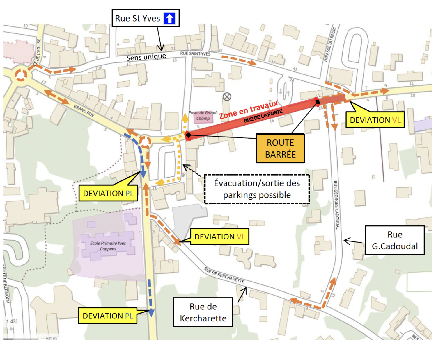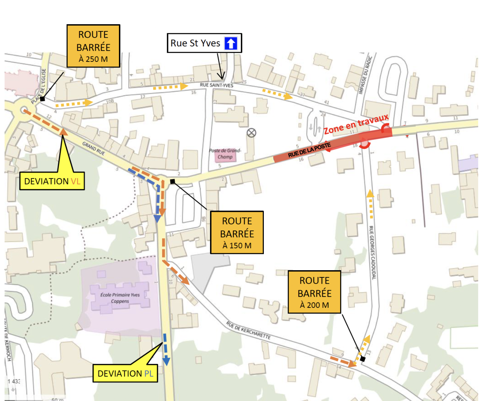 La rue de la Poste sera barrée du giratoire de la mairie jusqu'à l'intersection avec la rue Saint Yves à tous les véhicules sauf ceux de l'entreprise intervenante. Les véhicules légers seront déviés par la rue Saint Yves ou par la route de Vannes et la route Kercharette en fonction de l'avancée des travaux.