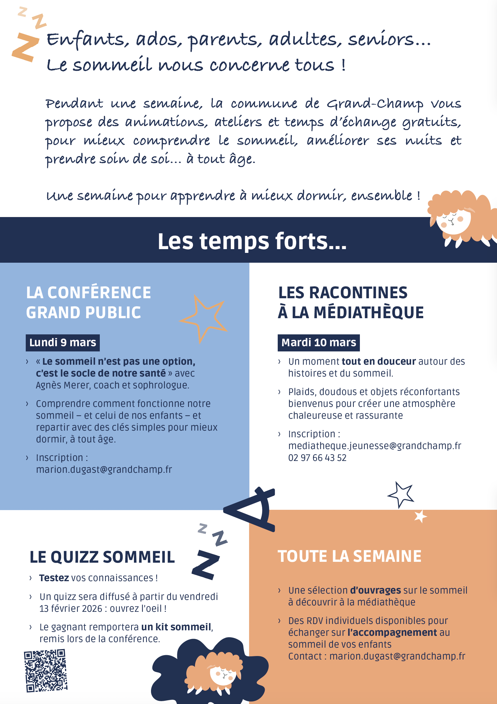 Pendant une semaine, la commune de Grand-Champ vous propose des animations, ateliers et temps d’échange gratuits, pour mieux comprendre le sommeil, améliorer ses nuits et prendre soin de soi… à tout âge.