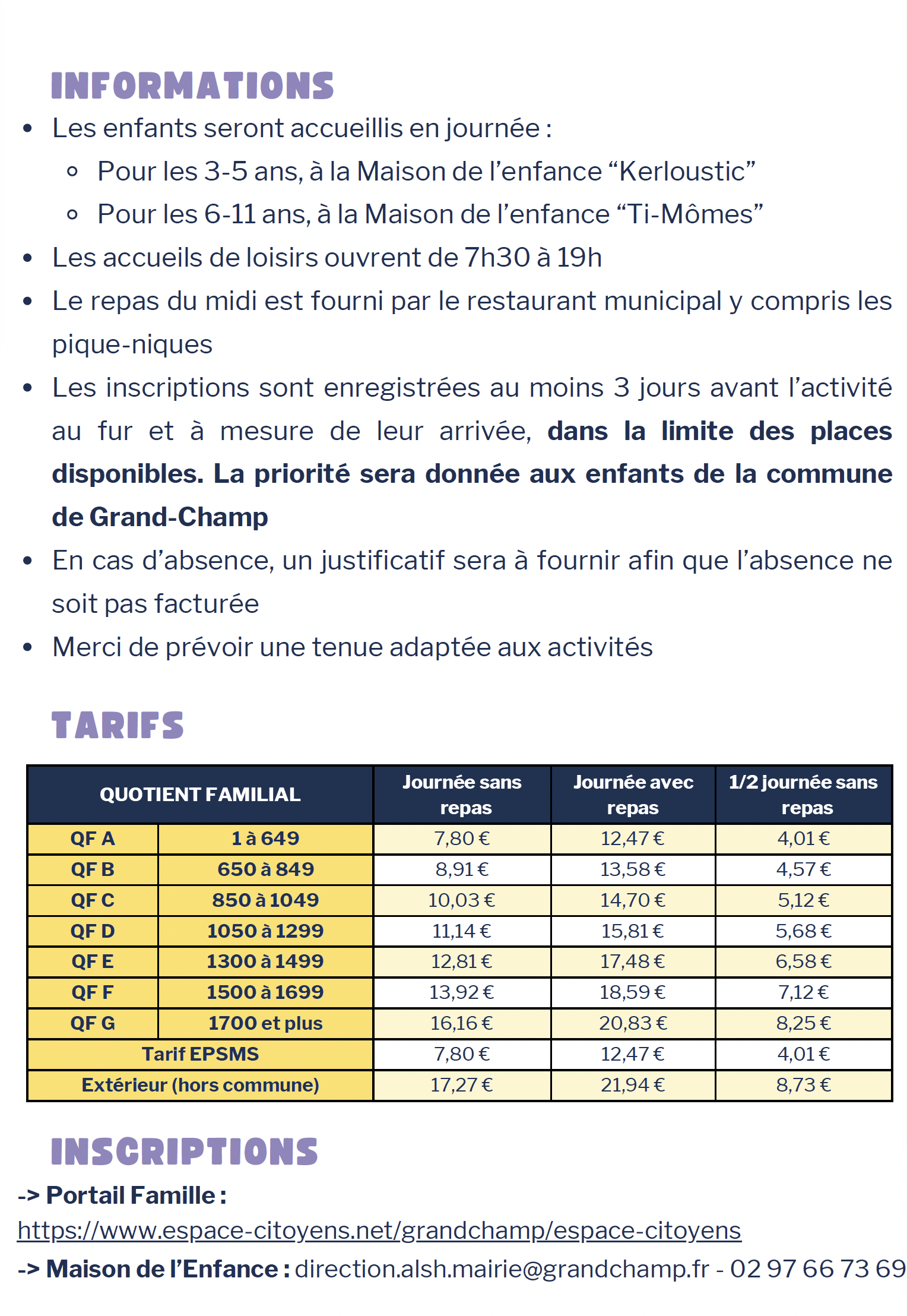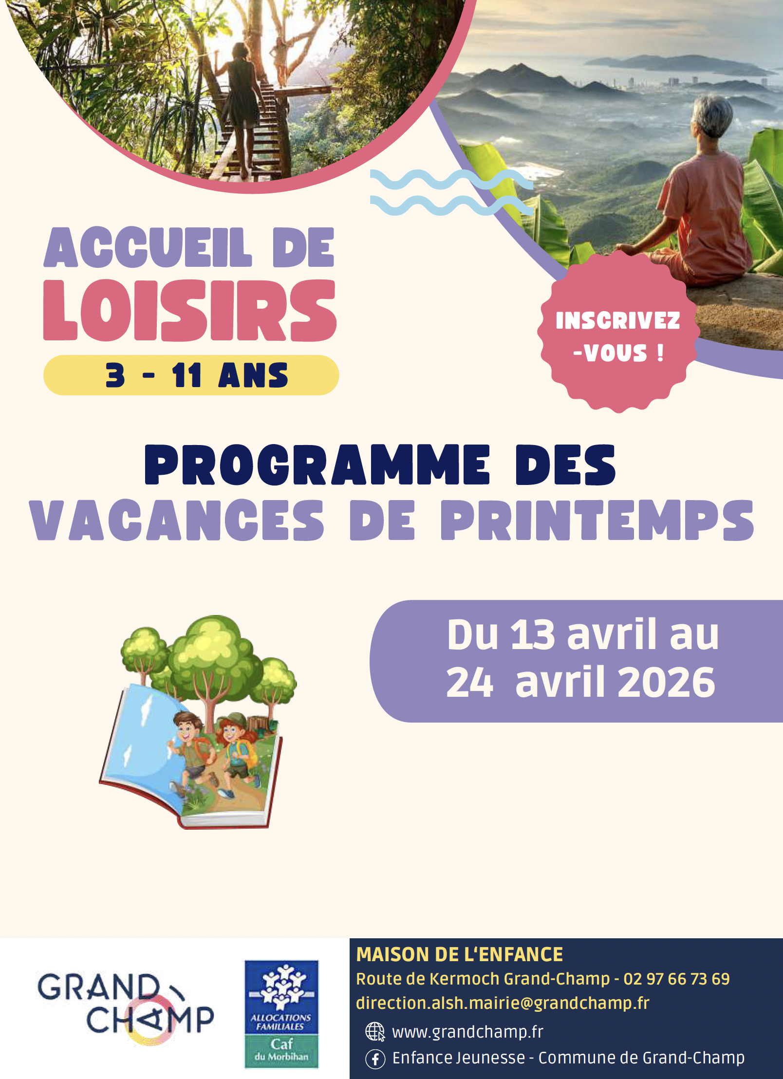 Contact : Maison de l'Enfance / 02 97 66 73 69 / alsh.mairie@grandchamp.fr