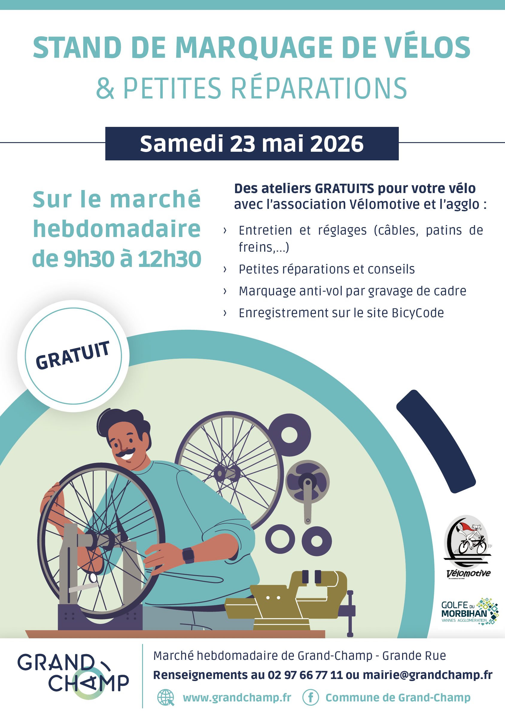 Golfe du Morbihan - Vannes agglomération et l'association Vélomotive tiendront un stand de marquage de vélos et de petites réparations le samedi 23 mai 2026 sur le marché hebdomadaire de Grand-Champ.